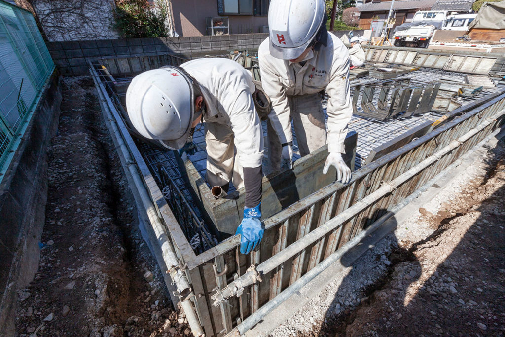 この日は、基礎の型枠施行中の現場にやってきました。既に外側は型枠でぐるりと囲われているので、これから内側の型枠が入ります。基礎の立ち上がりの幅が一定になるよう、鉄筋とスペーサーは施工済みです。