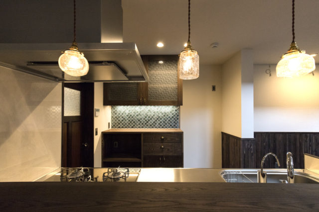 キッチンもライトアップされて美しいです。レトロな雰囲気の照明器具は、お施主様の支給品だそうで、空間にとてもマッチしています。