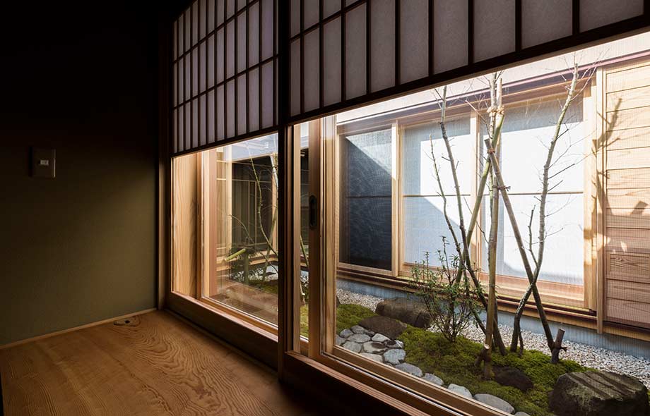 円窓の障子を開くと、切り取られた絵画のような絶景が現れる。