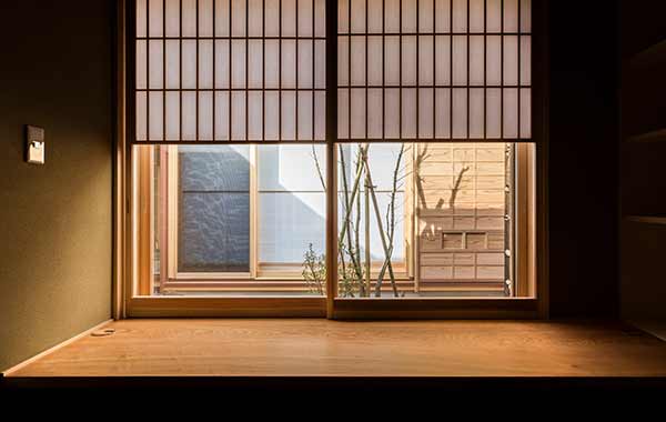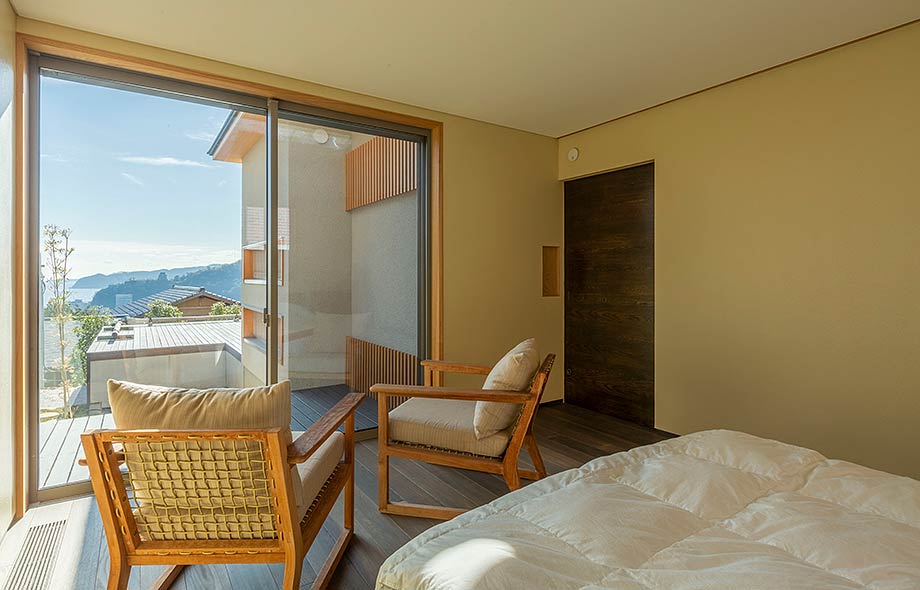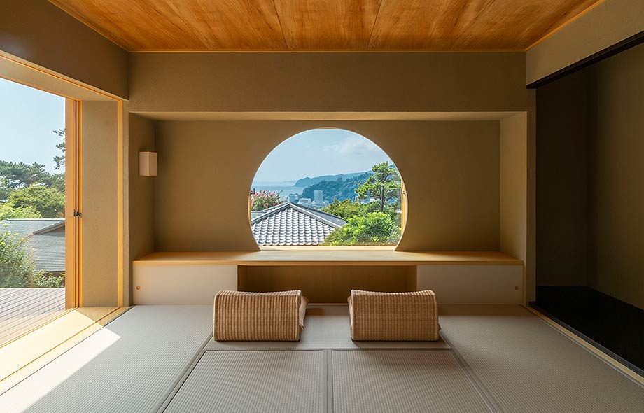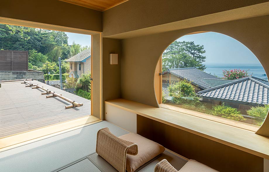 リビング、和室、浴室、寝室にそれぞれ海が見える窓を設け、各空間に合わせた見え方となるよう工夫している。