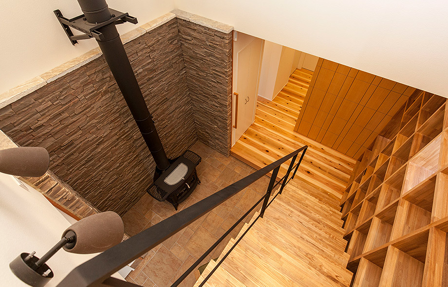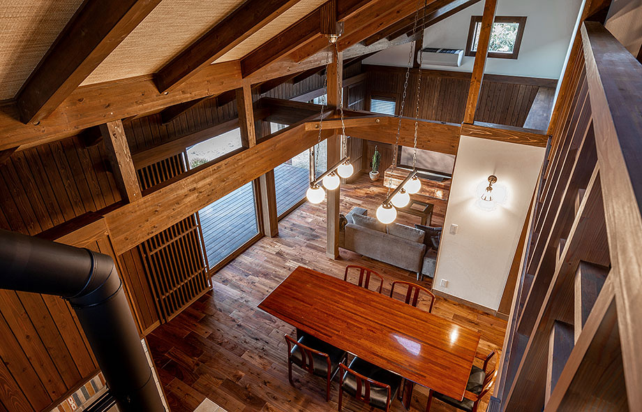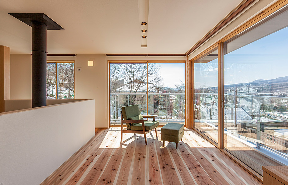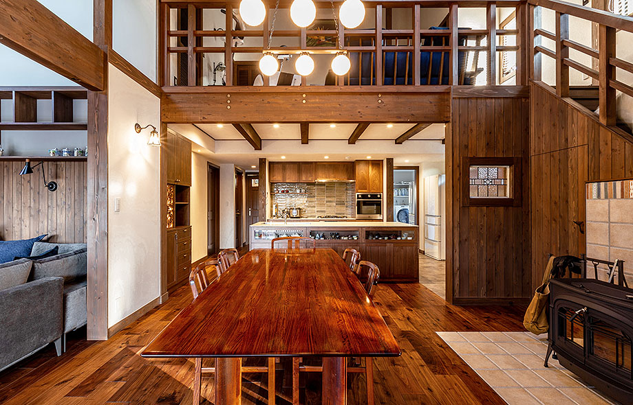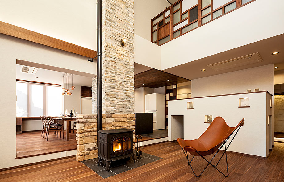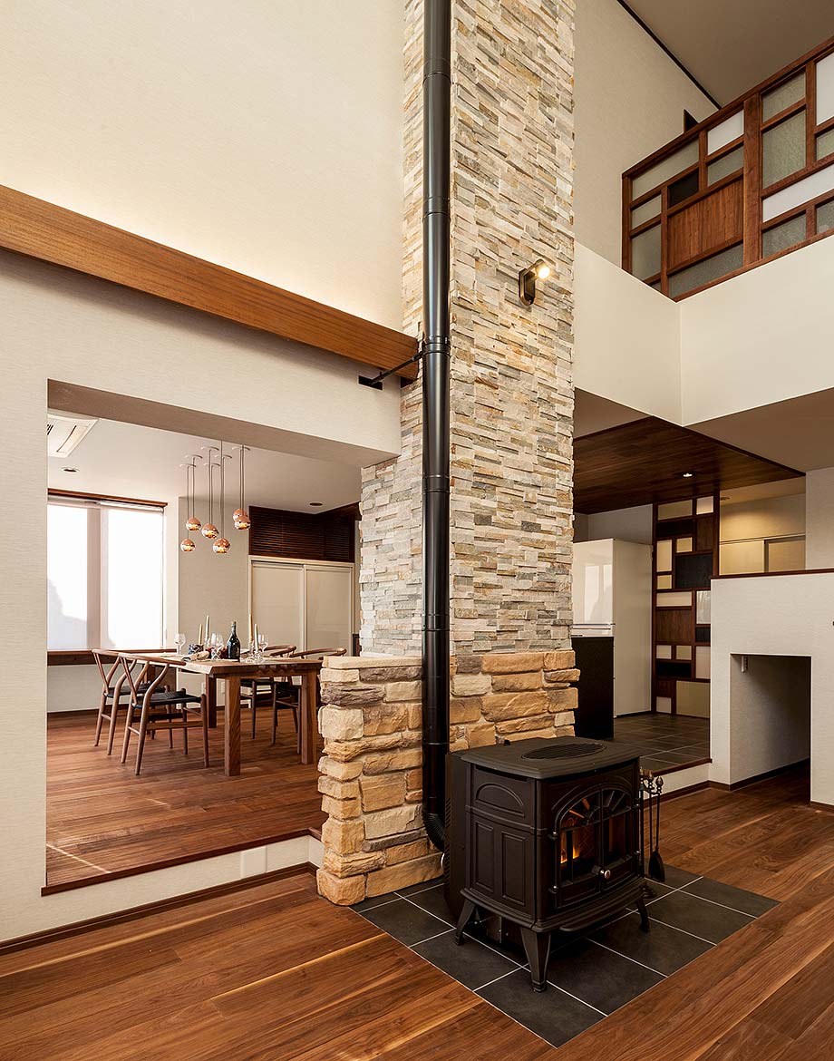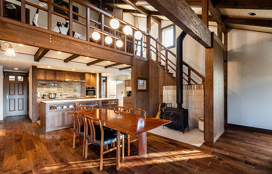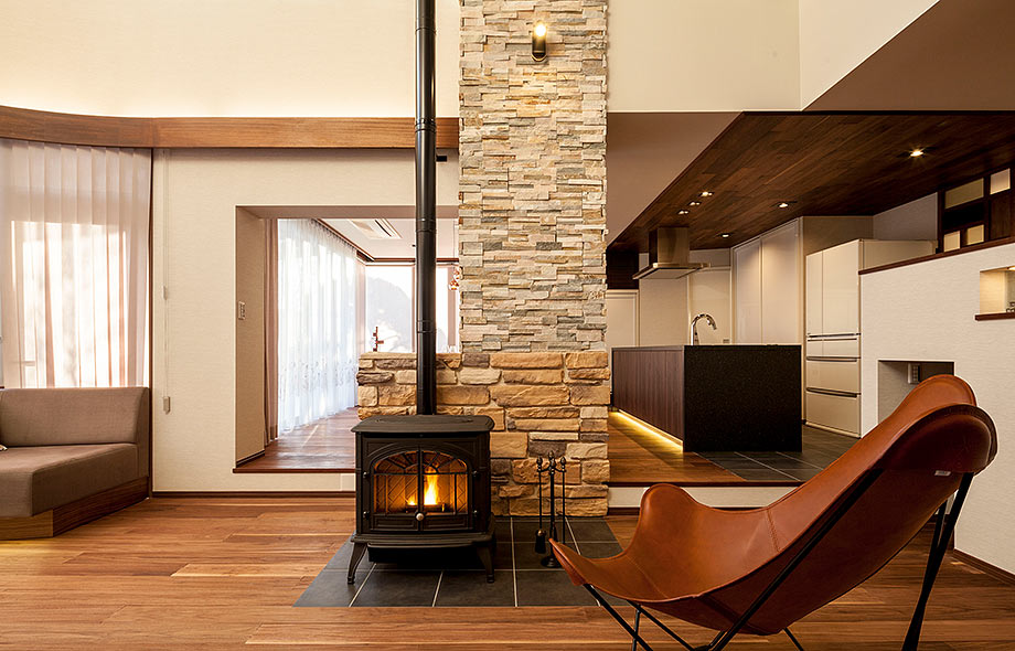 縦にも横にも広い空間は、床暖房とペレットストーブでむらなく暖まる。