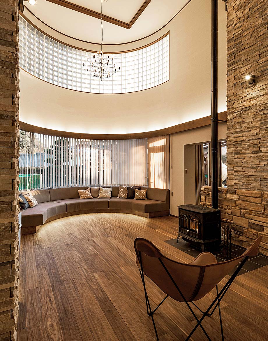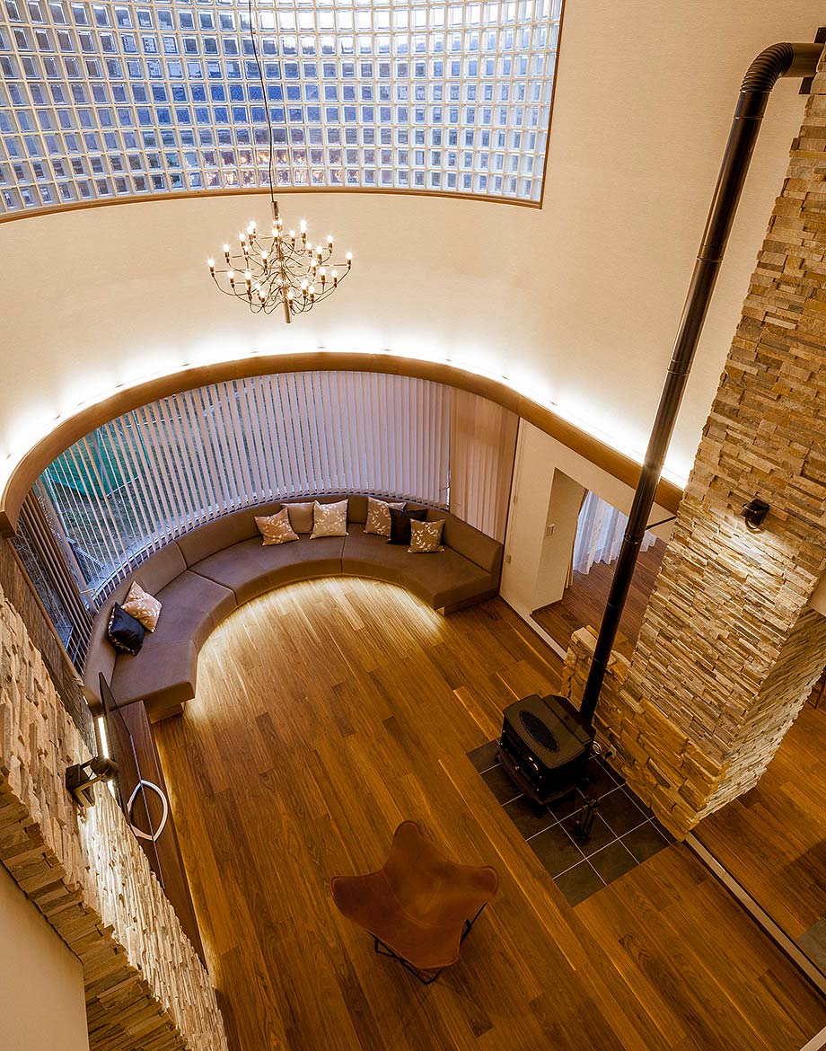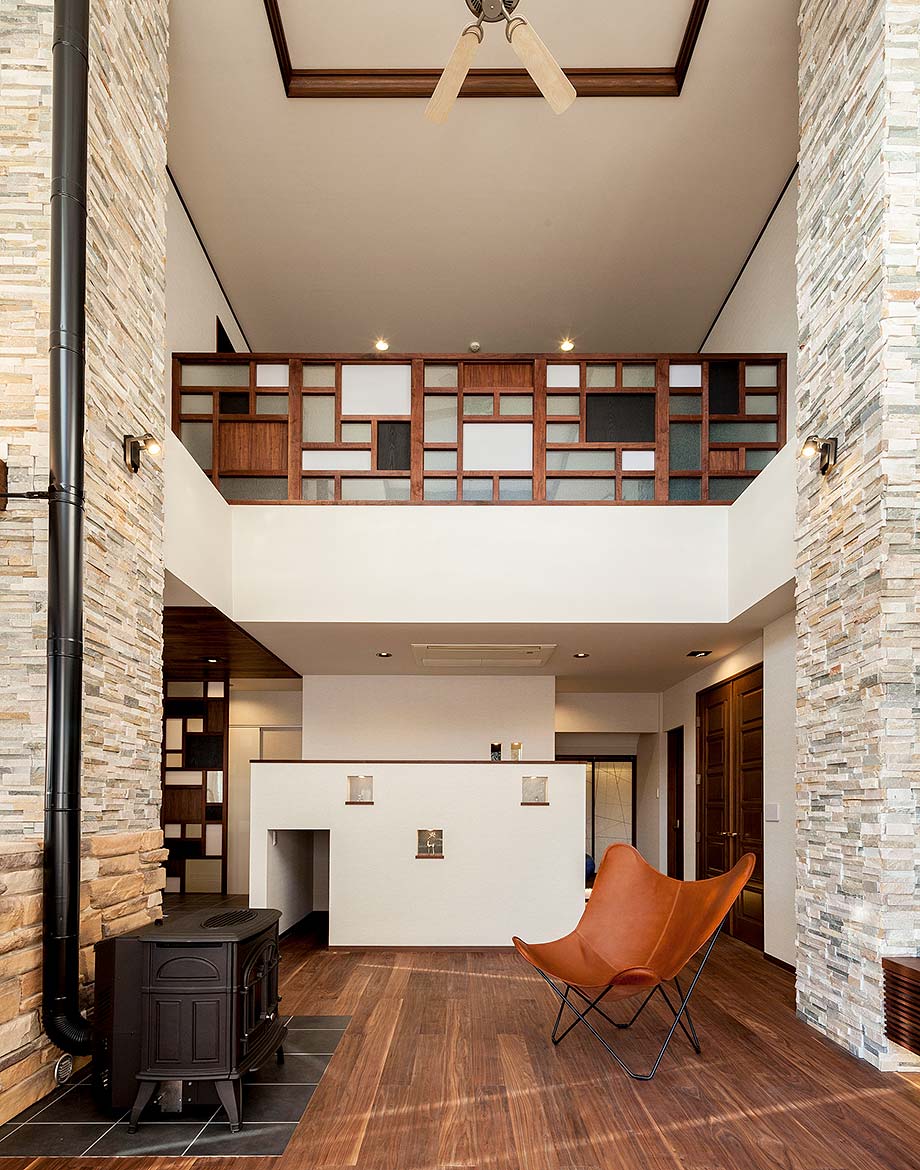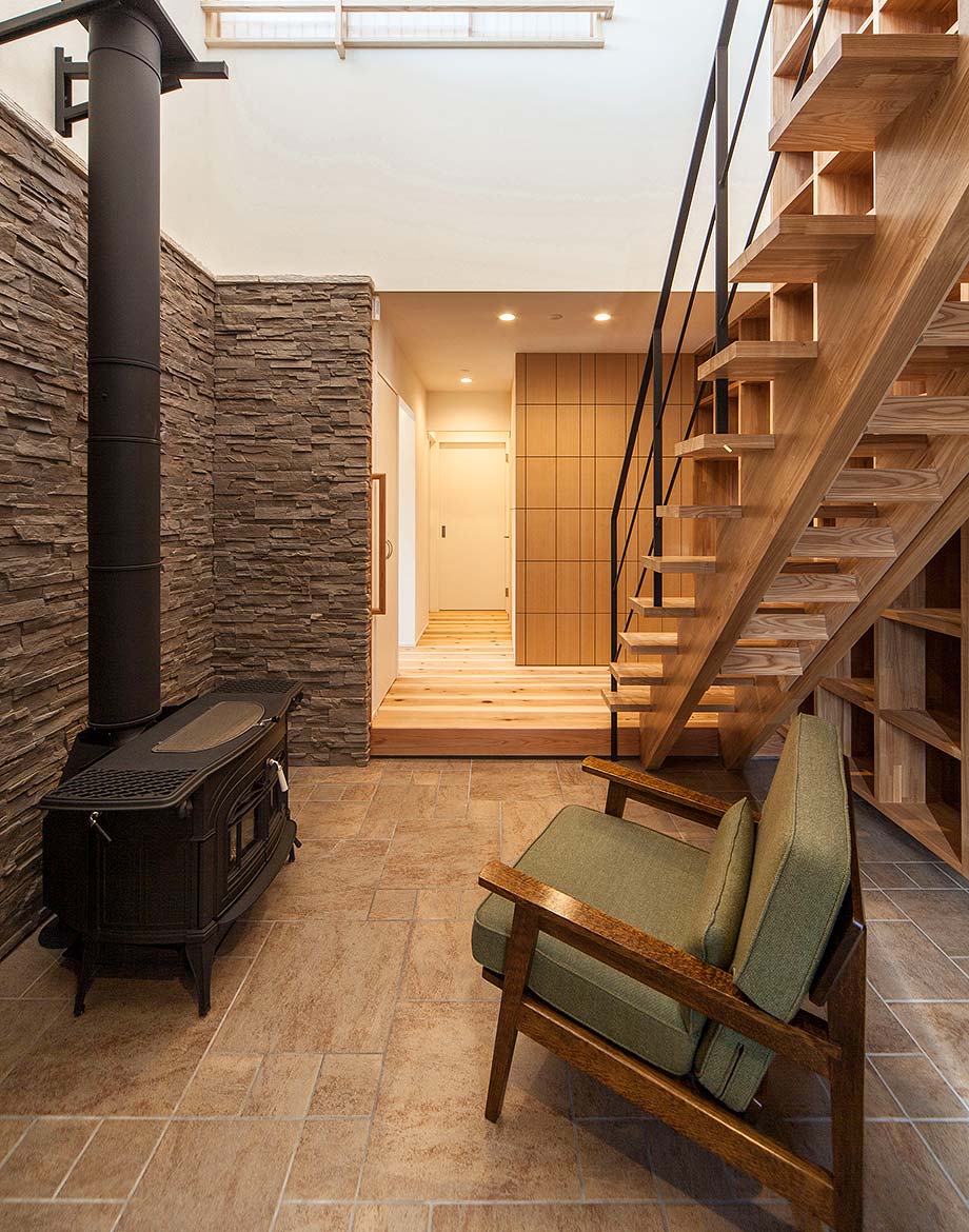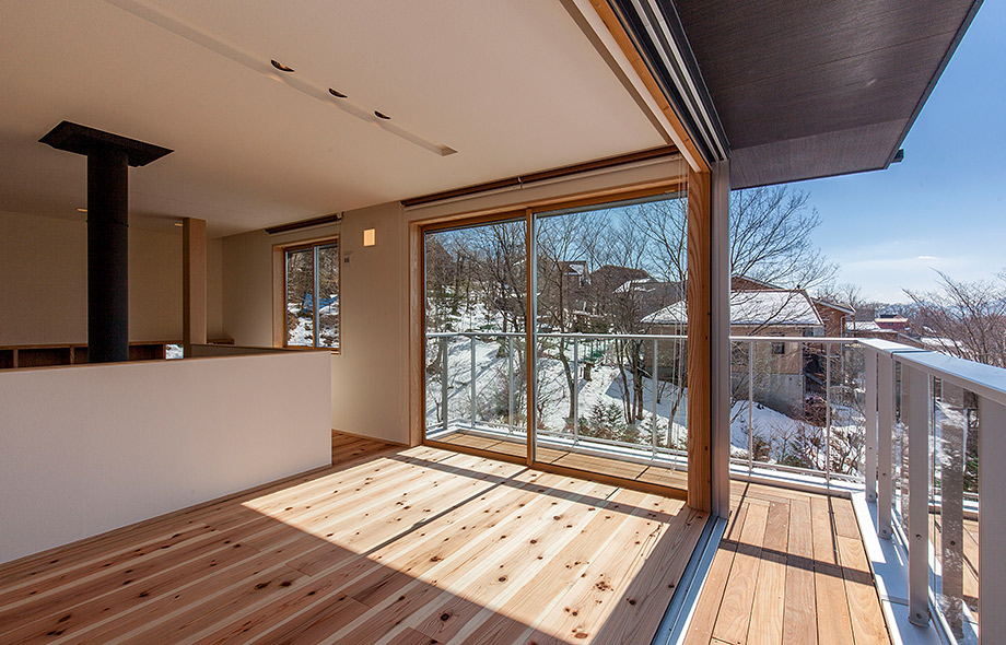 縦にも横にも広い空間は、床暖房とペレットストーブでむらなく暖まる。