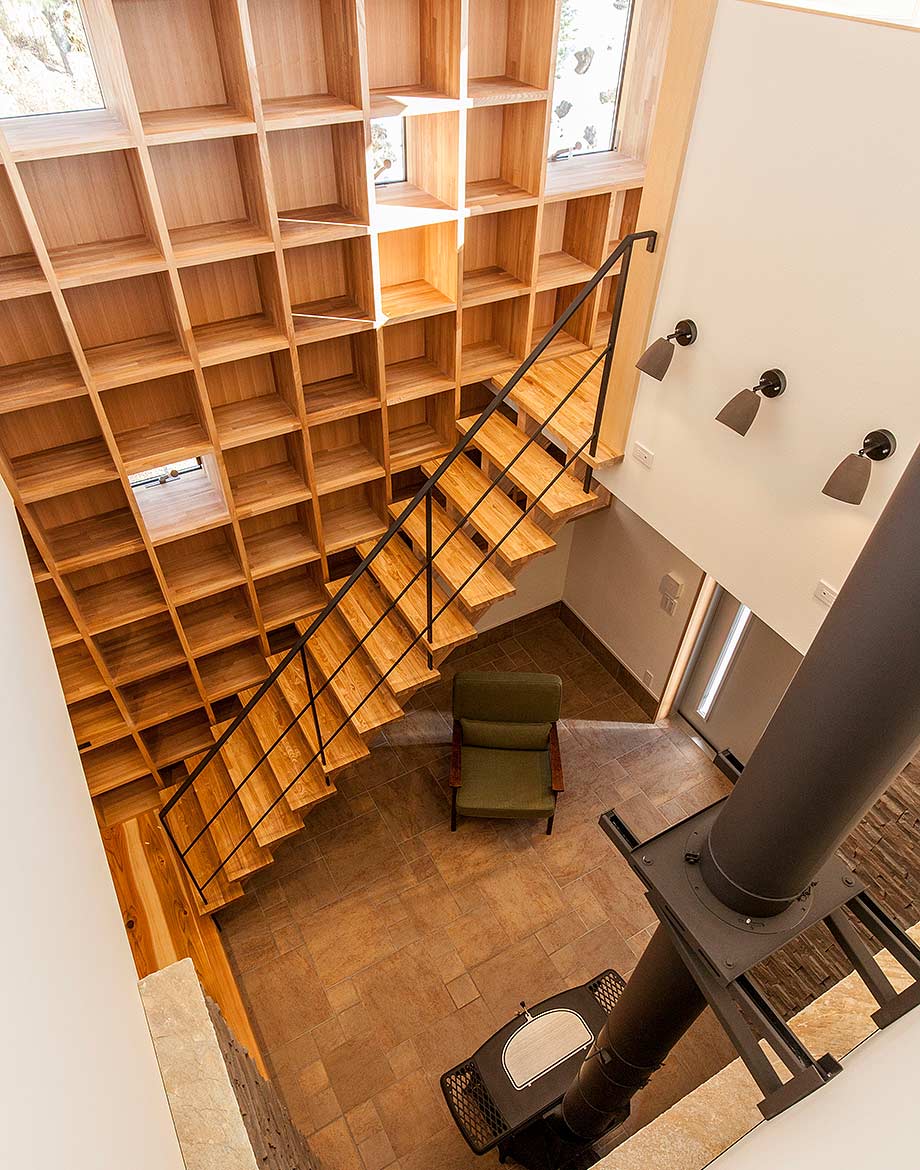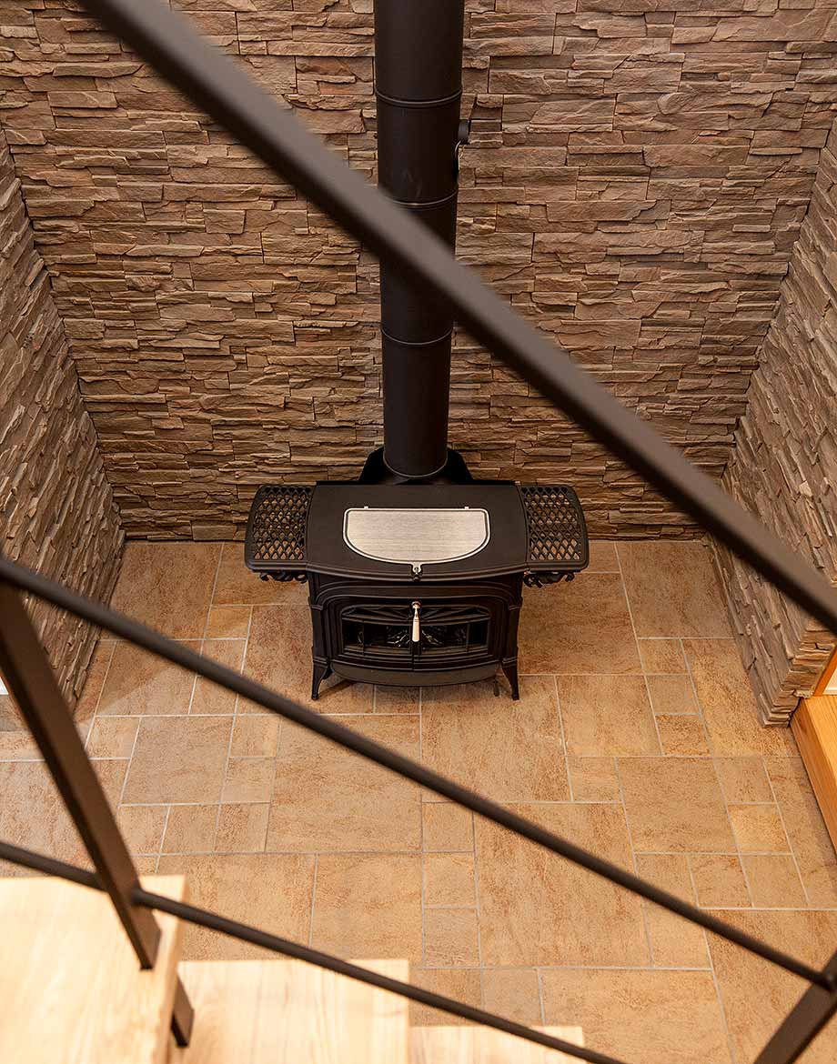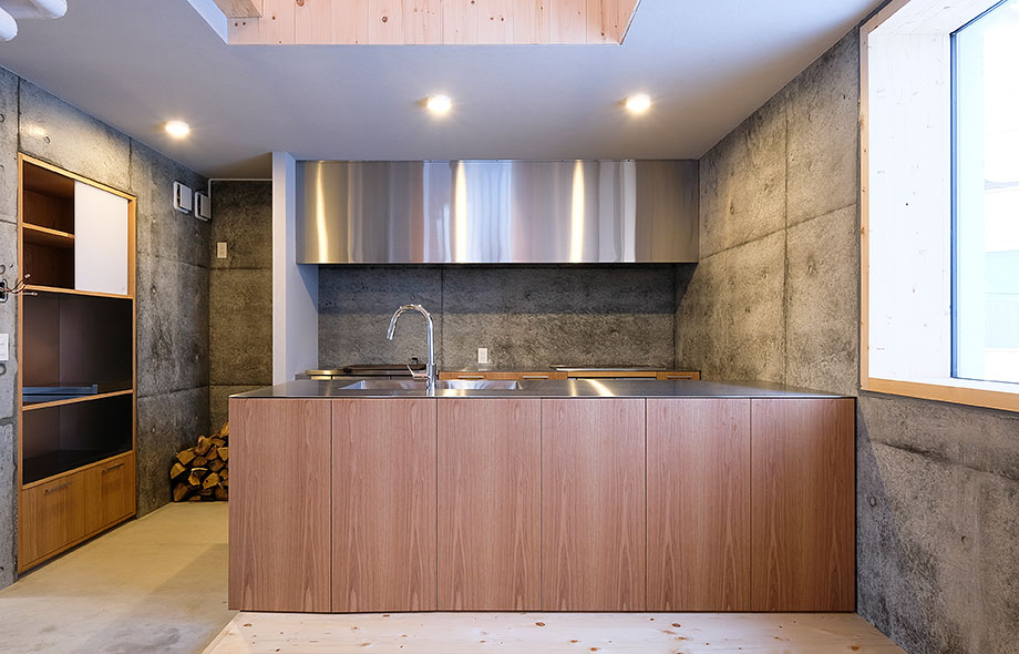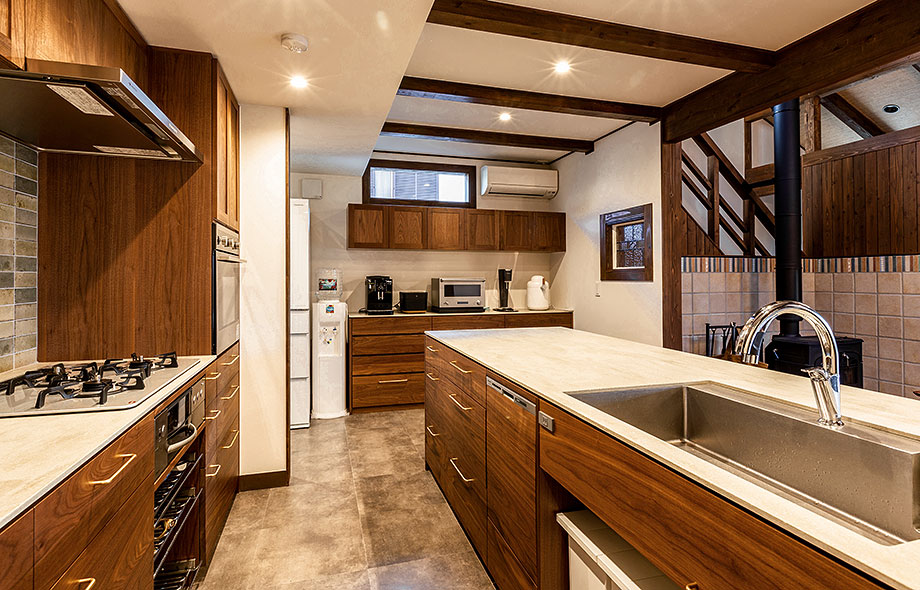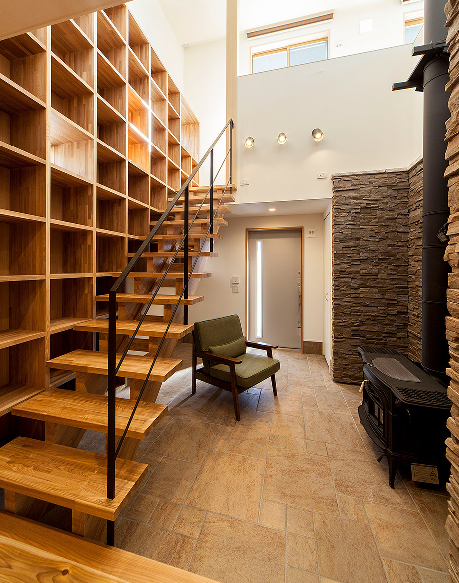 縦にも横にも広い空間は、床暖房とペレットストーブでむらなく暖まる。