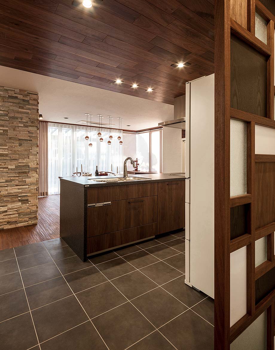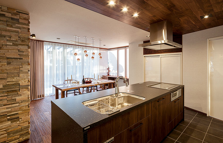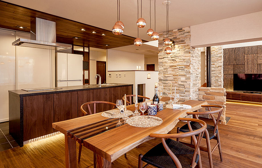 天然石を1枚ずつ積み上げて造作したアクセントウォール。独特な重量感で上質な空間を演出。