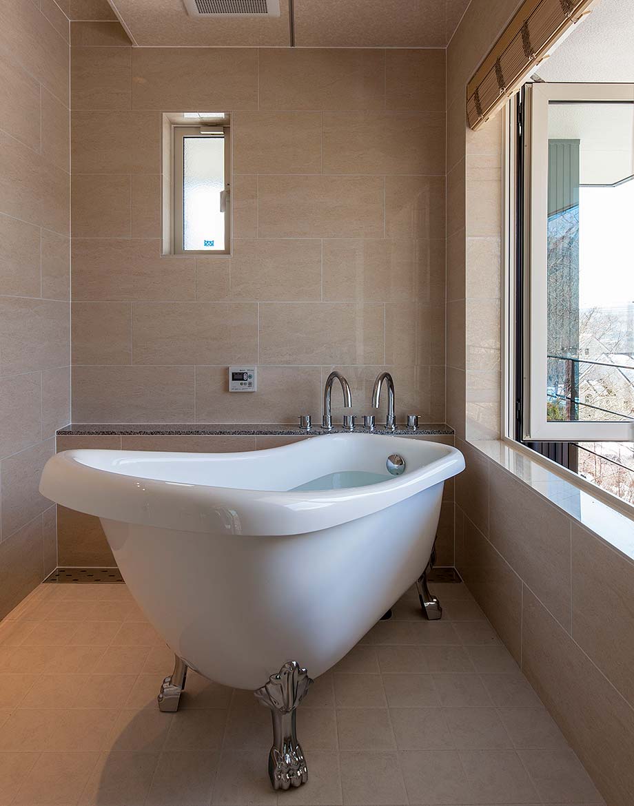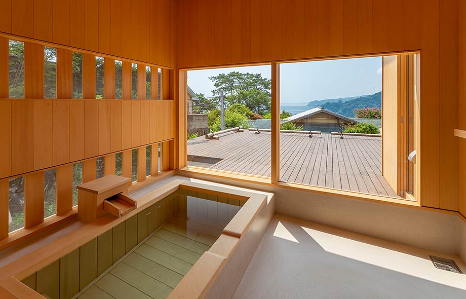 浴室の窓は、近接する樹木と遠くの海を同時に眺められる「疲れを癒す窓」。