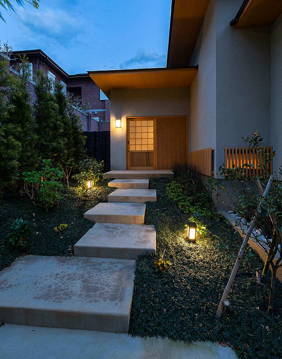 リビングに踏み込んだ際の視覚効果を演出するため、敢えて閉鎖的な印象に纏めた細長いアプローチ。