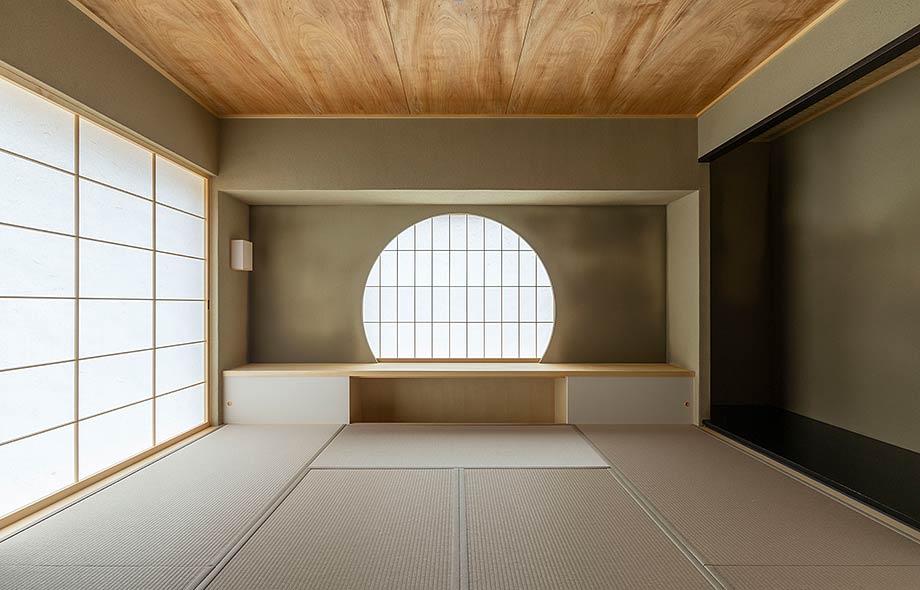 和室に設けた書院と円窓(えんそう)。窓の手前にある棚は「書院甲板(しょいんこういた)」と呼ばれ、書き物をしたり読書をするためのスペース。