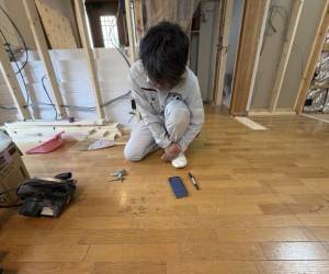 おはようございます。角谷由美です。昨日から、無垢の床を張り始めました。と、その前に・・・??考え中の