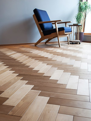 大工が手掛けた、バーチ材を45度に組み合わせた床は、光の当たり具合で色が変わって見えます。