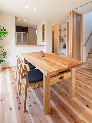 左官仕上げの塗り壁と、日本瓦の「一文字軒」が美しい外観のお住まい。内装には無垢の木をはじめとする自然素材を使用し、屋内は心地よい空気に満たされています。