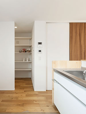 キッチン脇には乾物や缶詰などの保存食品をたっぷりと収納できるパントリーを作りました。