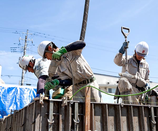 一人で幾つもの職能をこなす多能工。複数の作業を一人で行うことで、人員交代のタイムラグが生じず、施工精度も統一されます。 型枠を外した際に気泡がないこと、表面が均一でなめらかであることは、施工精度の高さを証明しています。