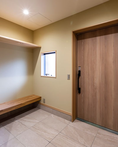 玄関には広めの土間を設けてベンチを設置。接客スペースとしました。ベンチ上部には神棚を祀る予定です。