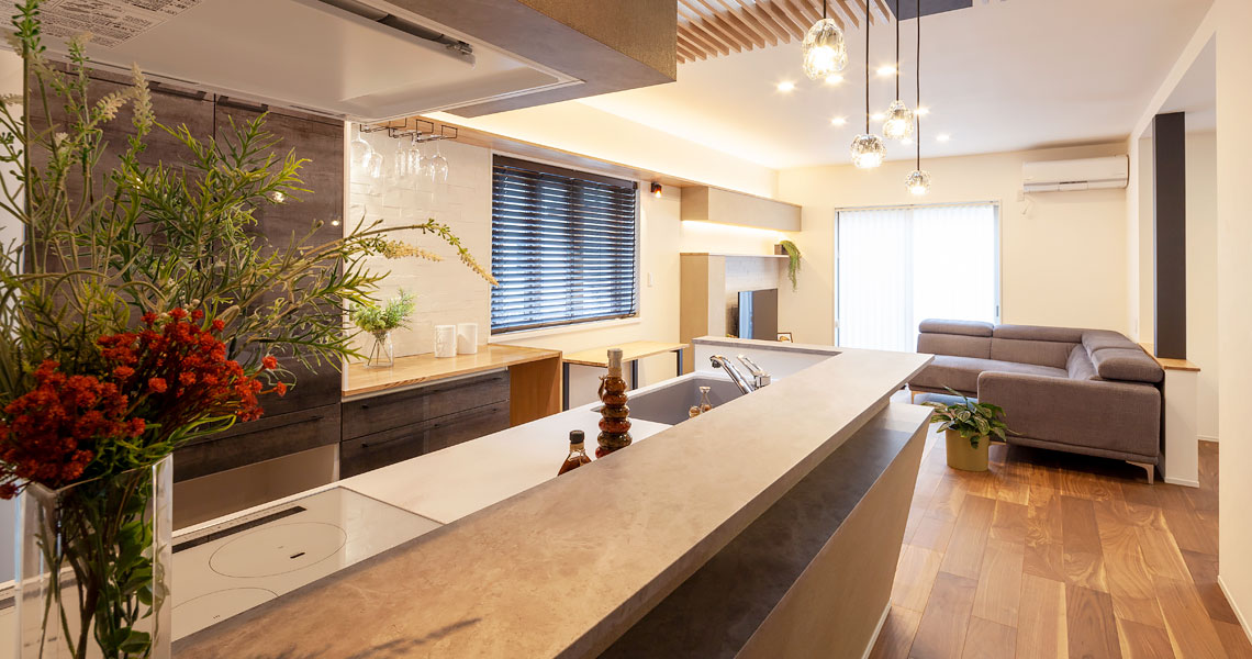 間取り変更によりLDKの入り口がキッチン寄りになりましたが、配置やデザインを工夫することでキッチンまわりが気にならず、友人を招きたくなる素敵な空間に生まれ変わりました。