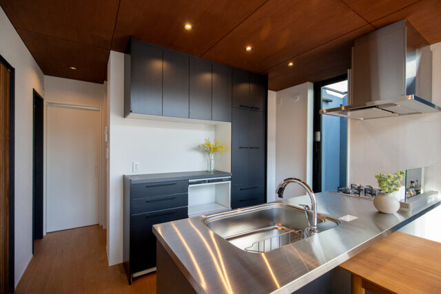 軽やかなデザインの鉄骨階段にはトップライト(天窓)から光が落ち、エントランスホールを演出します。また、玄関脇には通り抜けられるシュークローゼットと、すぐに手洗いのできる洗面スペースを設けています。