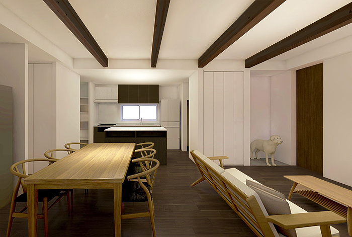 住まいの中心となるLDKでは、濃色に着色した相生杉の床や見せ梁が和モダンな雰囲気を演出。