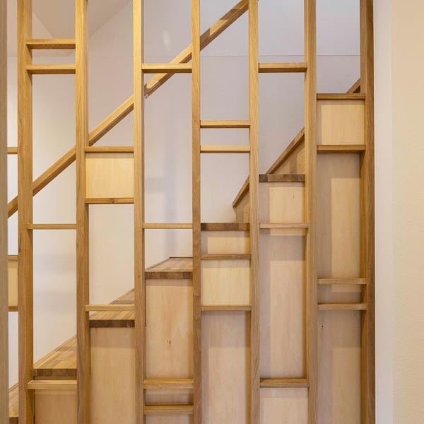 階段は側面を格子にすることで、天井のトップライトからの光を1階まで導きます。格子は写真立てにもなるデザイン。