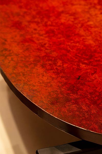 日本の伝統技術である漆芸の技を現代建築に施しました。木に塗るのが一般的な漆ですが、コンクリート、ケイカル板、漆喰、鉄、布など様々な素材と組合わせることで、それぞれにまた違った魅力が見えてきます。更に時間が経つにつれ透明感やツヤが増し、美しさが増していきます。また、見た目の美しさだけでなく、防水性や抗菌性にも優れる天然塗料として古くから漆器などの日用品にも施されてきました。その手に吸い付くような触り心地も他の塗料には無い特徴です。100%天然素材の漆に是非触れてみてください。