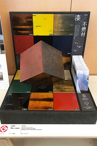 現代建築における漆の可能性を追求し、一般的に漆の下地としては用いることのないアルカリ性の建材(コンクリート・ケイ酸カルシウム板など)に特殊な技術を用いることで美しい漆の仕上げを可能としました。 素材の持つ表情を活かした漆独特の意匠表現が可能となり、漆の新しい可能性を感じさせます。