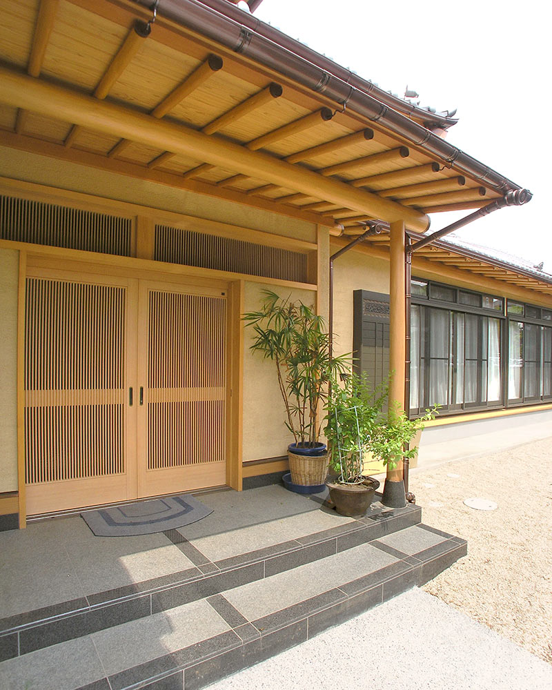 落ち着きある和の佇まいの玄関。床部分には仕上げ方法の違う御影石を使用した。