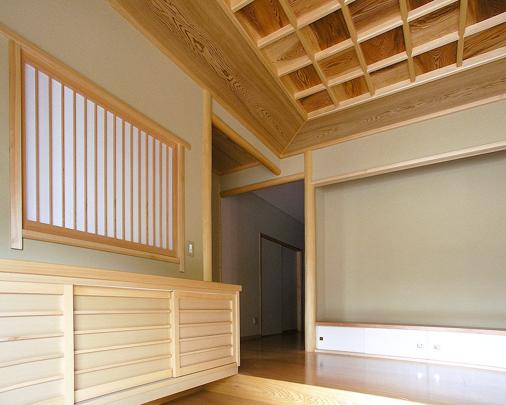 ヒノキの格子天井の玄関。玄関の正面には飾り棚を設け、季節感を演出する。