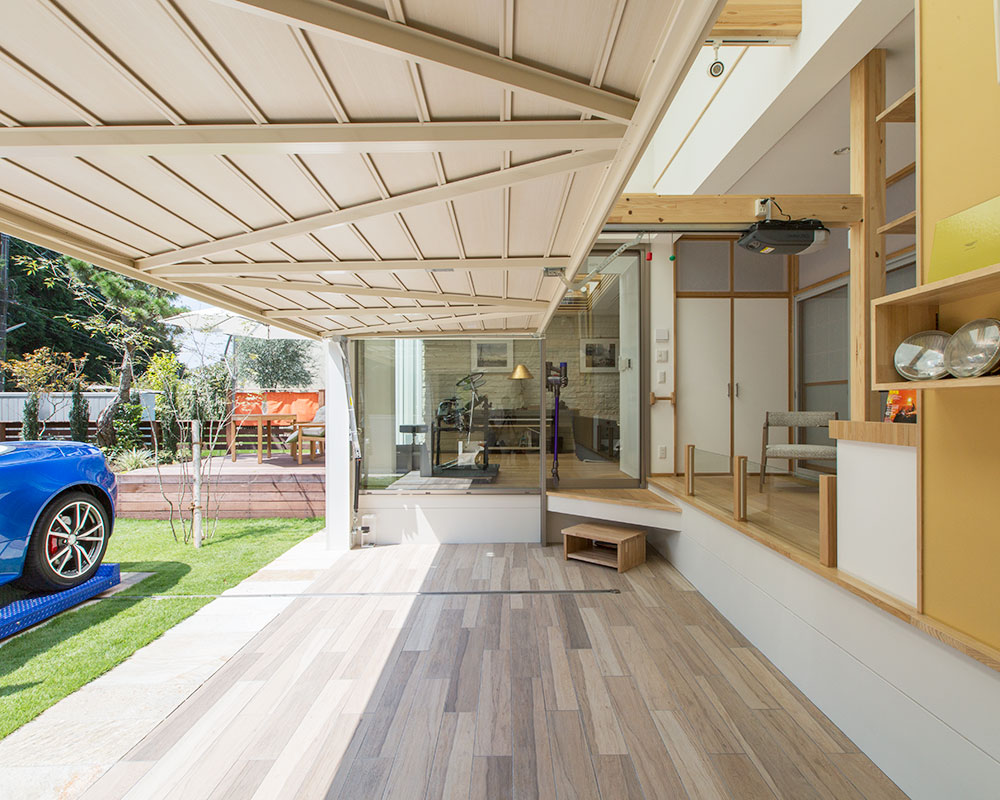 市街化計画の厳しい条件をクリアしながら、大きな庭を持つ和風住宅にプロヴァンス風の趣味の空間を増築しました。 英国メーカー・アストンマーティン(Aston Martin)のスポーツカーを収納するガレージや、ドラムセット、ドライブシミュレーターのシートなど、開閉・出し入れには電動ギミックが満載。 随所に凝らされたこだわりに思わずにやりとしてしまう、いつまでも遊び心を忘れない大人のための秘密基地です。