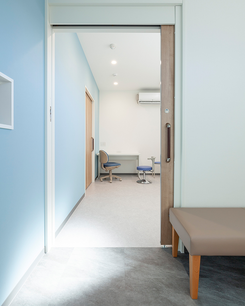 感染者用の入口からは、感染者専用待合、感染者専用診療室という動線とした。感染が疑われる患者様は隔離した別室で診療と処置ができるよう配慮している。