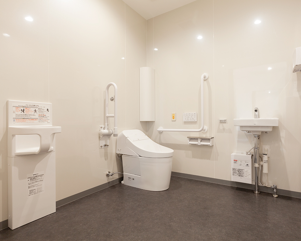 段差のないバリアフリーのトイレ。車いすでもゆったりと入れる広さを確保している。広々としたトイレ内は、お子様のおむつ替えにも対応している。内科に必要な検尿用の検査口も便座の正面に完備。