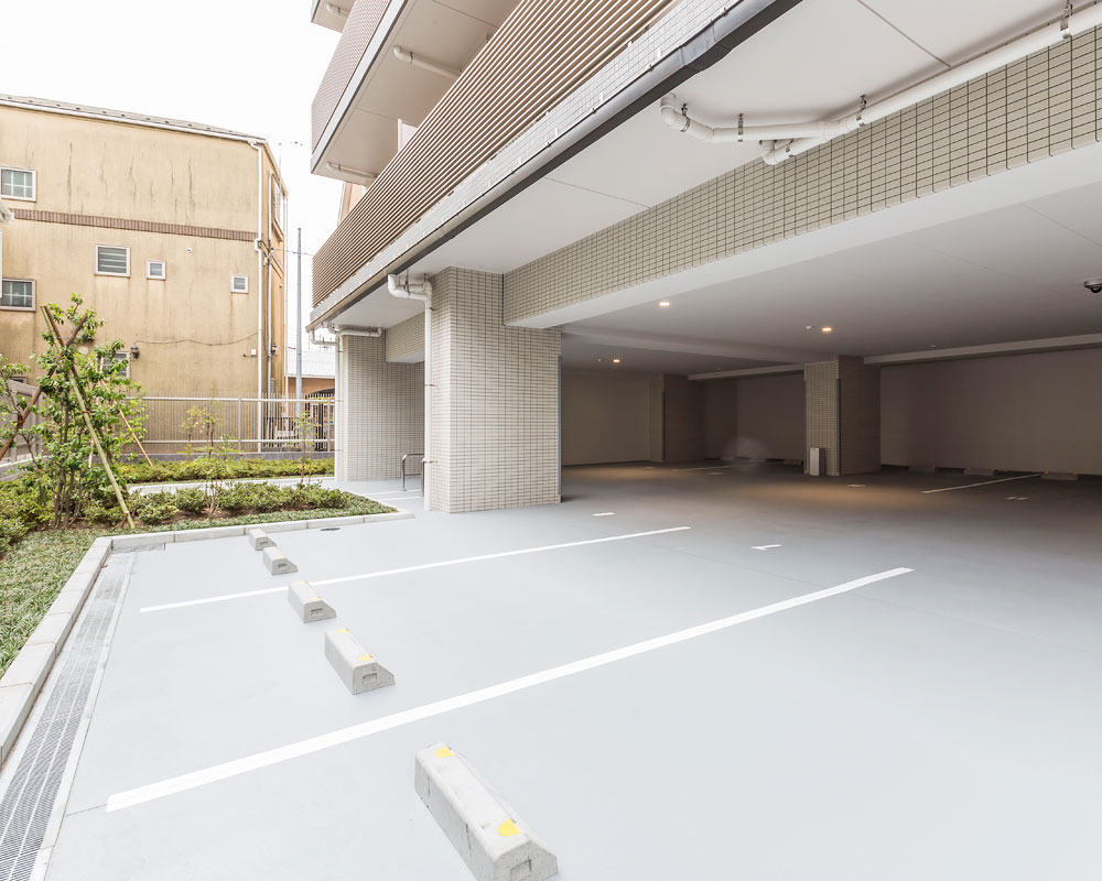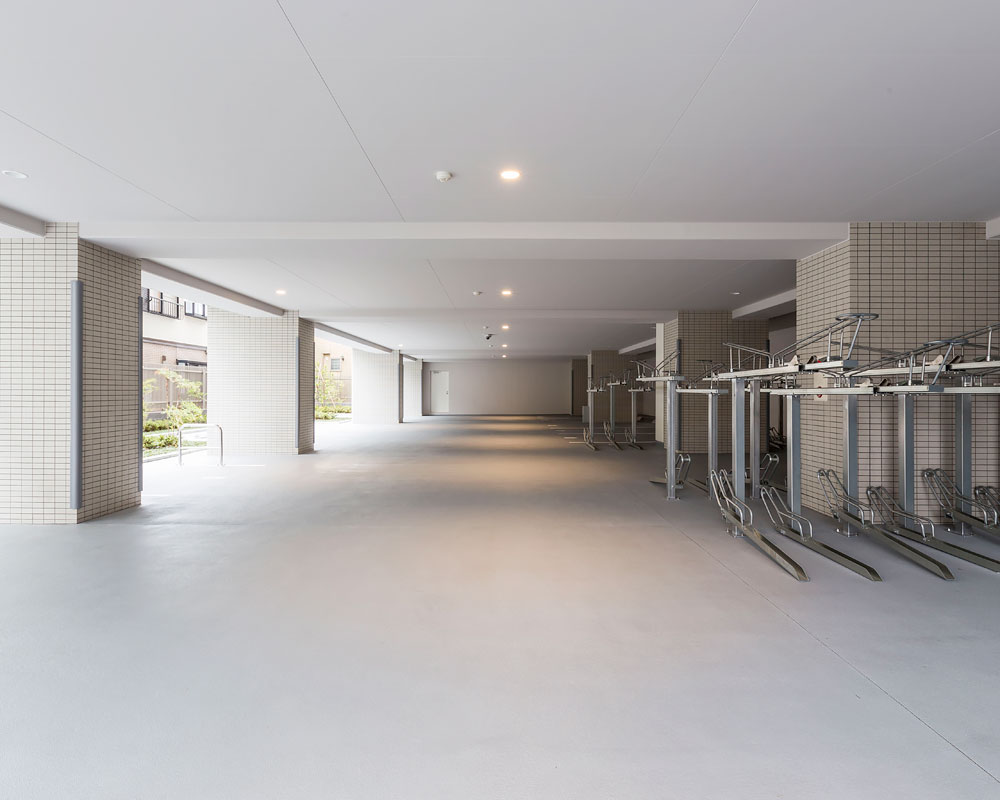 駐車場はすっきり見えるよう天井・梁型を納め、照明計画にも配慮。広々とした駐車場内には専用出入口を設け、雨天時にも濡れずにマンション内に入ることができるようにした。