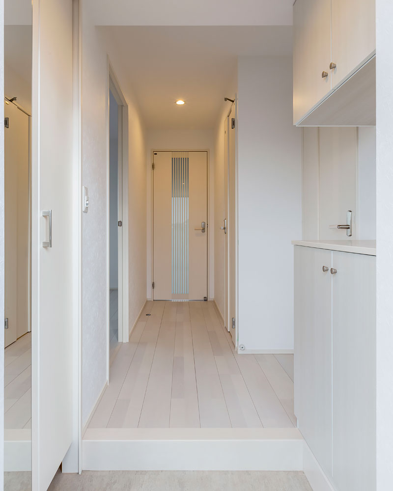 建具や床材に白に素材を用い、明るい印象となった住戸の玄関。ラーメン構造であるが、アウトフレーム構法によって居室には柱型が出ないよう配慮。