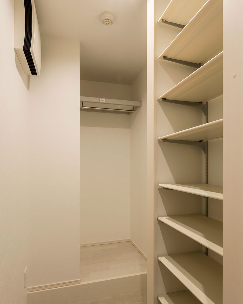二つの出入り口を持つウォークスルークローゼットは、どちらの部屋からもアクセス可能な共有空間。