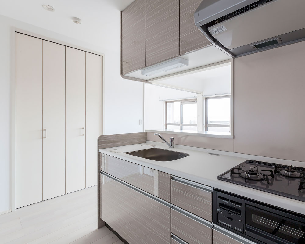 ファミリータイプの対面式キッチンは、人工大理石のカウンタートップを採用。壁面には収納力抜群のパントリーを設けた。