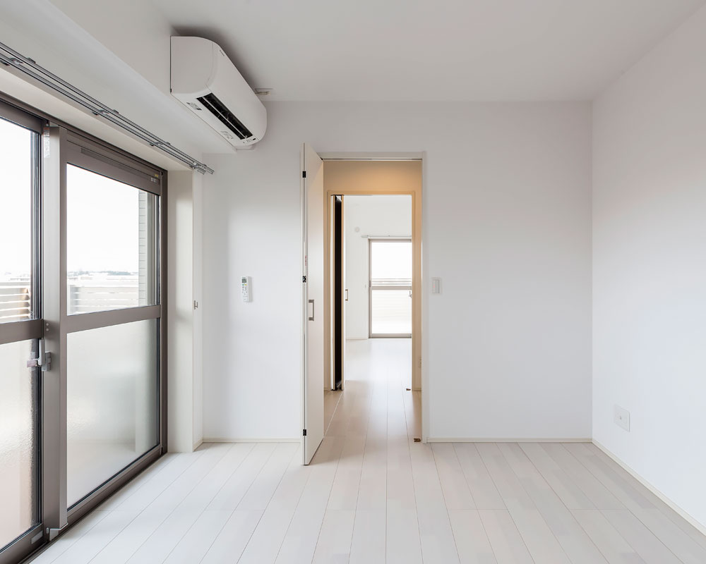 「住む人が自由にコーディネートできる」をテーマに、どんなインテリアにも合わせやすい白を基調とした空間に仕上げた。向かって右側の開き戸はウォークスルークローゼットに続いている。