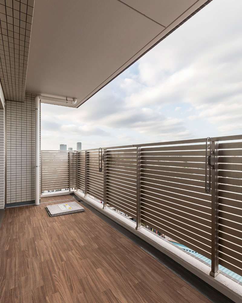バルコニーには木目柄の塩ビシートを採用。暮らしに潤いを与えている。