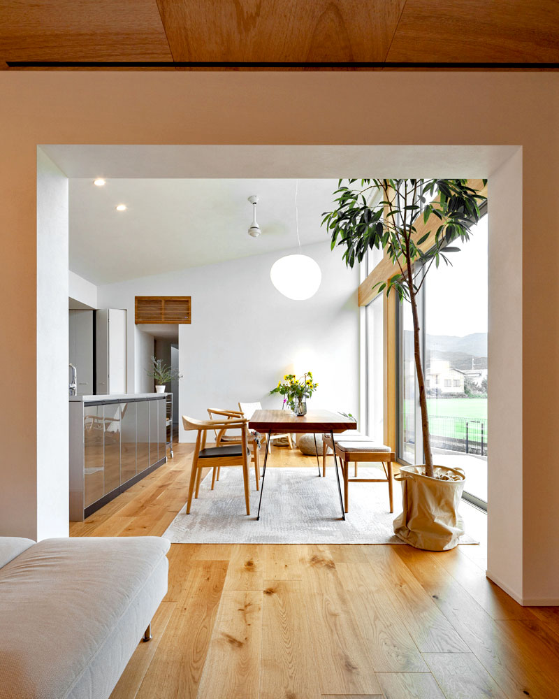 コンパクトに纏めた玄関の先には、壁の一面を全て窓にした開放感のあるダイニングが広がる。 法律上の制限により東側の土地に住宅が建つ可能性は低く、思い切った大開口を設けることができた。 建物を斜めに配置したのは、この大開口の方向を調整するため。