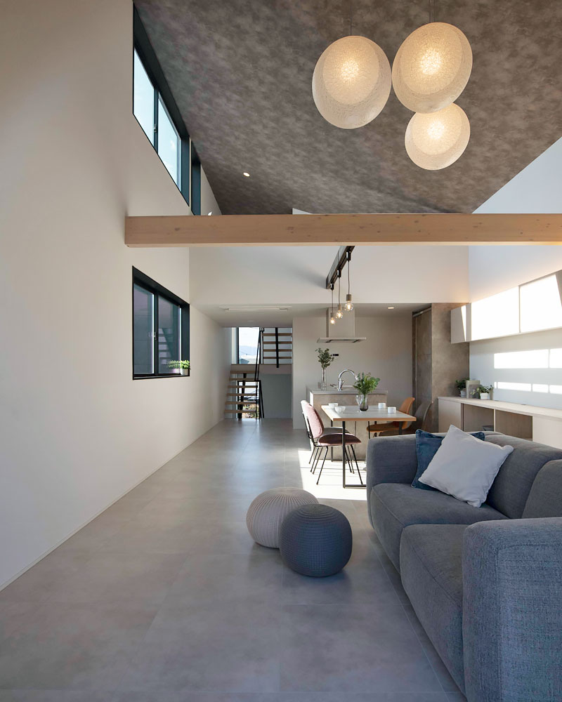 グレイッシュなカラーでまとめた2階子世帯LDK。空間を一つに繋げ、上部を吹き抜けにすることで縦にも横にも広がる開放的な大空間となった。 木造でも、構造計算を行うことでこのような大空間をつくることが可能になる。 2階、3階の床に採用したグレイのタイルはプラスチック製で、スタイリッシュな印象ながら、石張りのタイルよりも表面が冷たくないのが特徴。