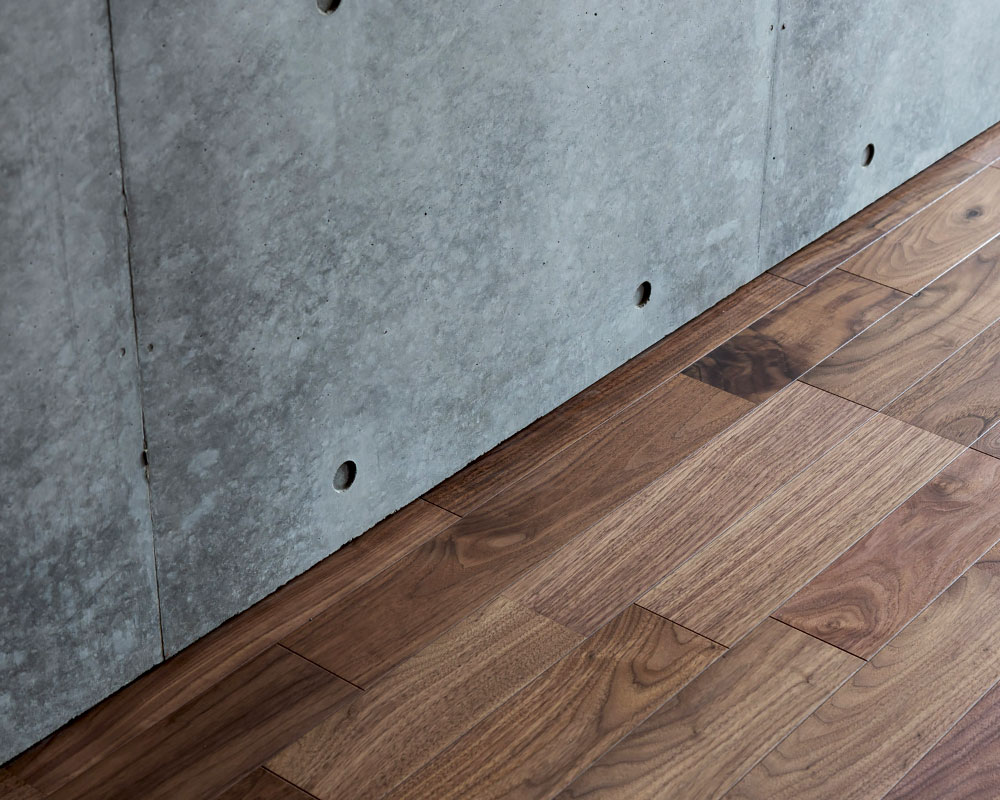 居室の壁面はフローリングとの対比をより美しく見せるため、敢えて巾木を設けずに施工した。