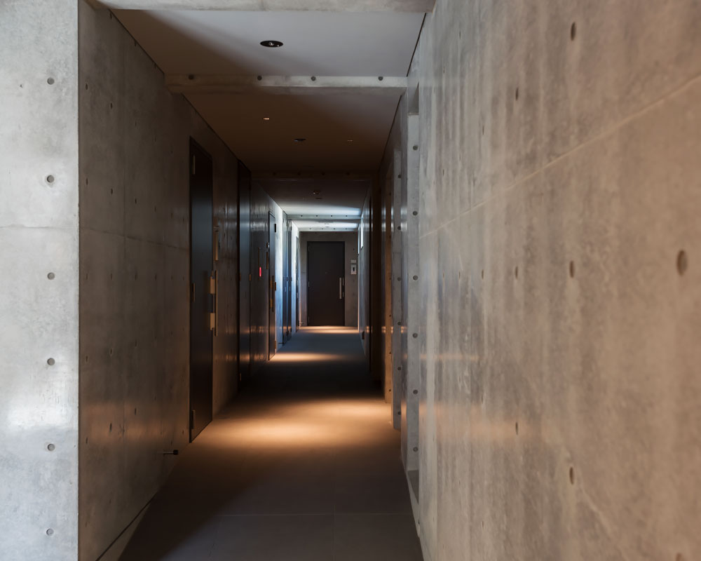 ⻑い期間人々に愛されることを目指したマンションです。住人が安らぎ、長く住み続けたくなる心地よさとは何かを考え、建物の素材の風合いや手触り、採光、経年変化までも思い描き、極限まで無駄をそぎ落としたシンプルなデザインとしています。素材本来の良さを追求し、建物の外観・内観はコンクリート躯体そのものをデザインに取り入れました。また、地域の方々にも親しまれる建築になれるよう、建物の周囲には積極的に植栽を設けています。