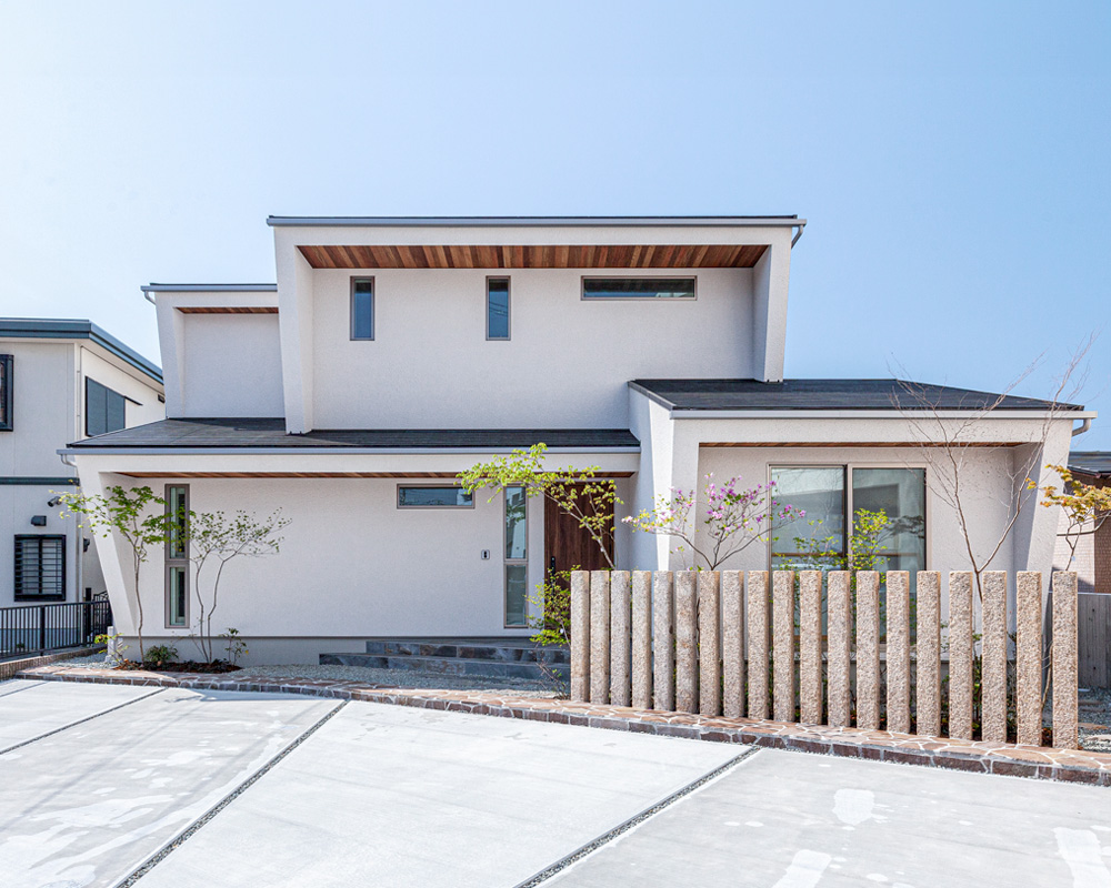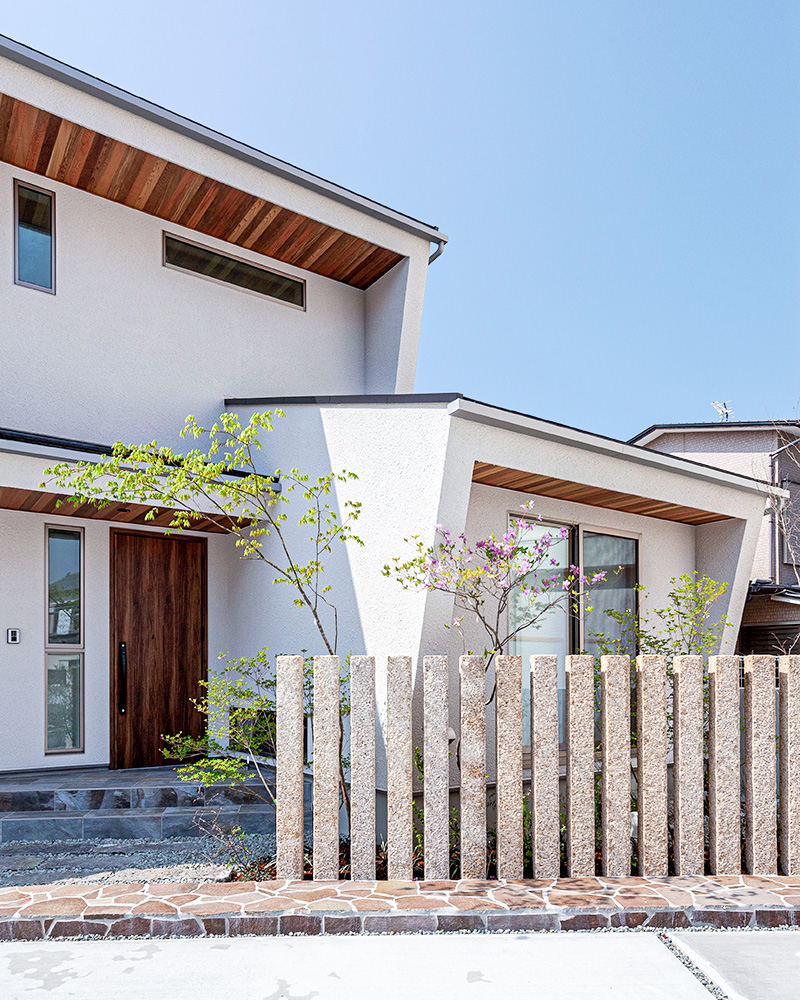 白い外壁にレッドシダーの軒天が映える印象的な外観。石柱が通りからの視線をやわらげ良いアクセントとなっている。