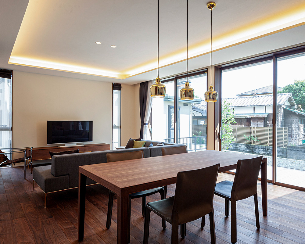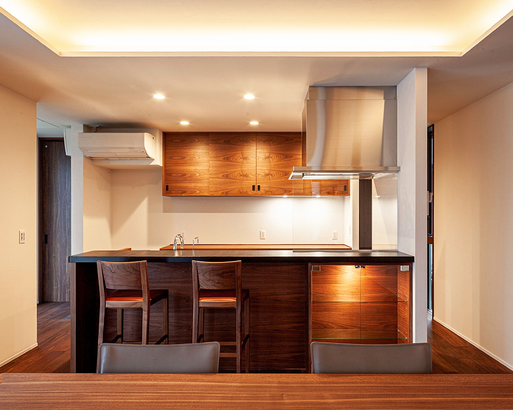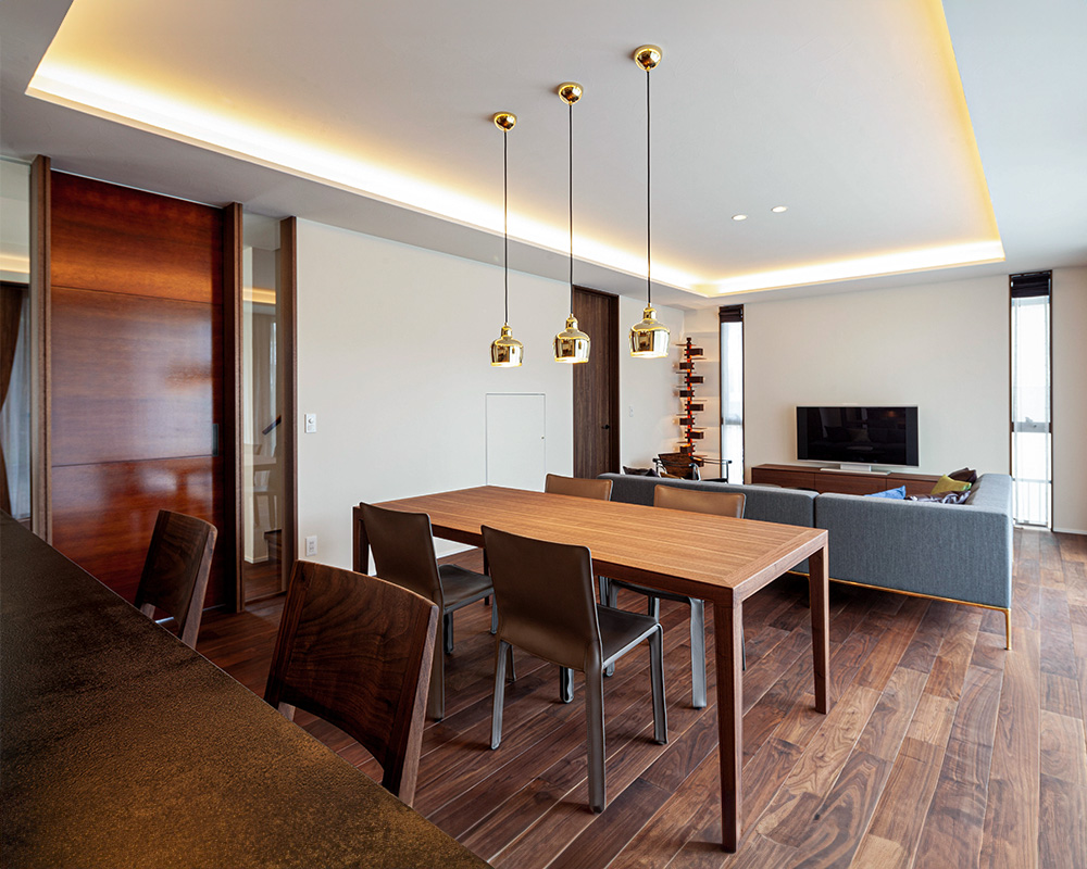 無垢のウォルナットの床、折り上げ天井、こだわりのインテリアが調和する、落ち着きある空間。