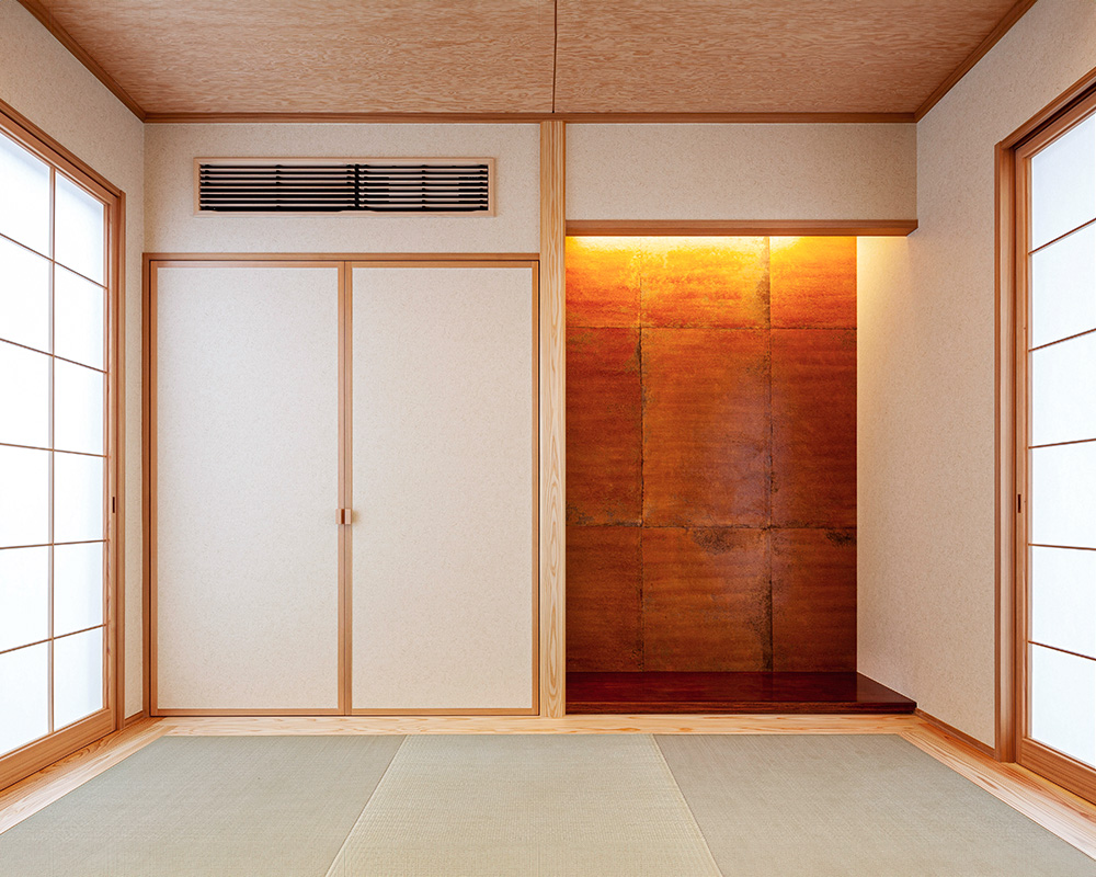床の間の壁は、漆和紙を採用。床板にも拭き漆を施した。