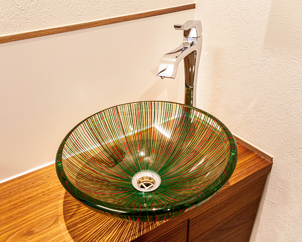 透明なガラスに漆を施した洗面ボウル。繊細な模様と陰影が、幻想的な表情を生み出す。