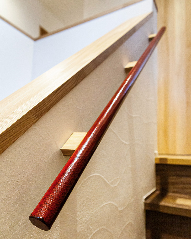 布目模様が浮かぶ漆塗りの手摺。手が触れる場所にも素材の美しさを施した、細部へのこだわり。