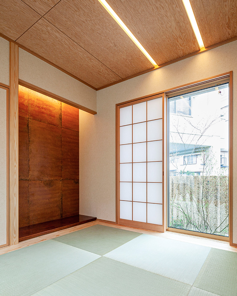 落ち着きある街並みに調和する、漆と自然素材を随所に取り入れた住まい。北側に切り離した和室と坪庭により、どの部屋にも光と風が届くプランを実現しました。LDKや水まわりには漆の意匠を随所に散りばめ、上質で静謐な空間に仕上げています。