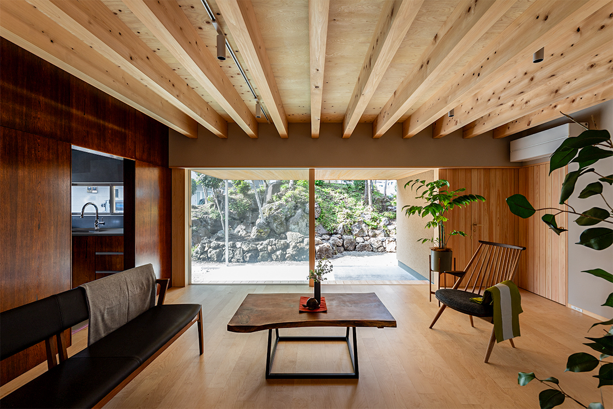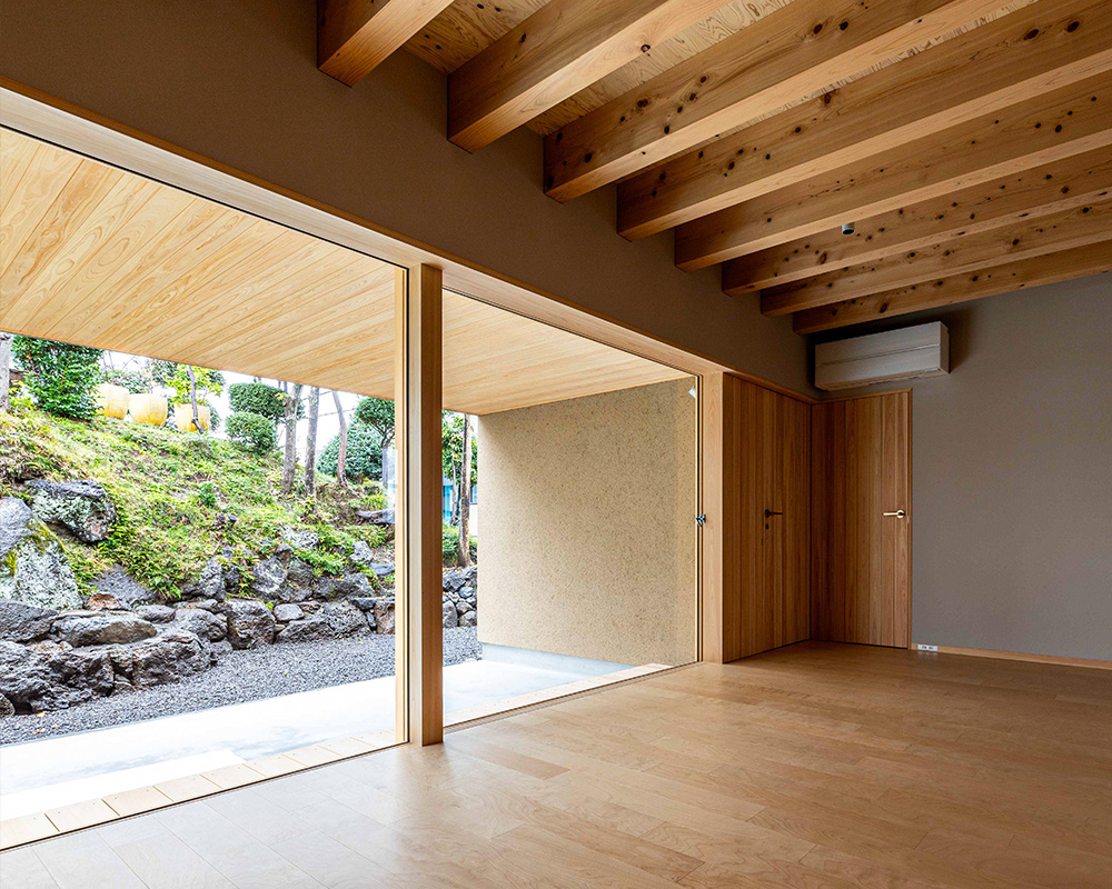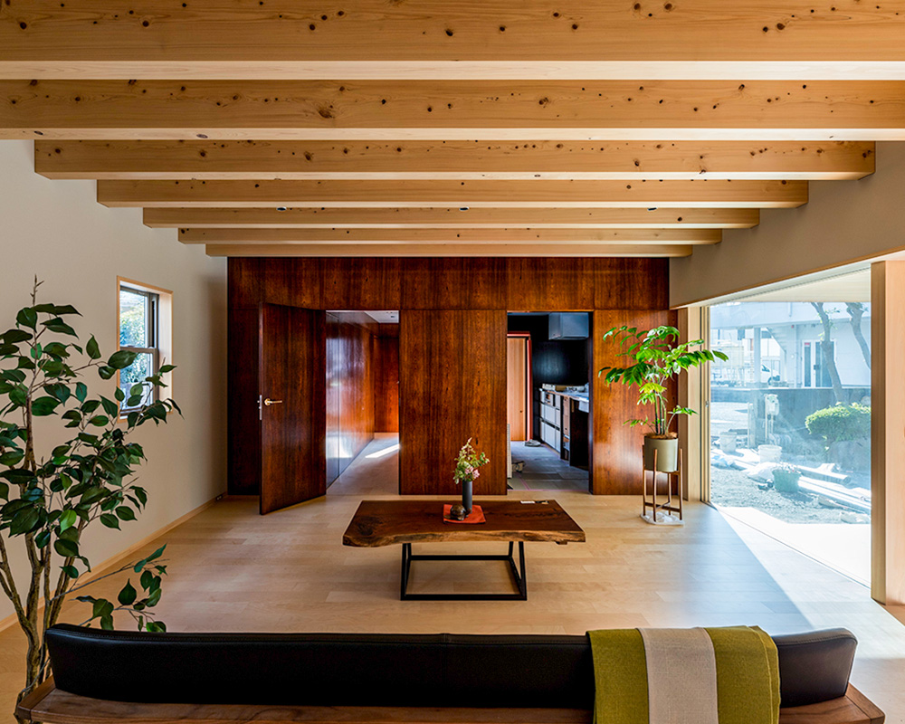 無垢檜を用いた梁をあらわしとし、天井高を2.5mに設定。庭に開いた大開口と相まって、広がりのあるリビング空間を生み出している。