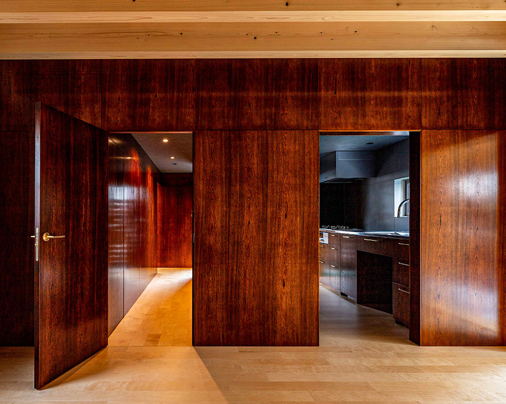 2枚の建具の奥には、それぞれキッチンと収納を備えた廊下が続く。生活感を見せずに動線を整理している。