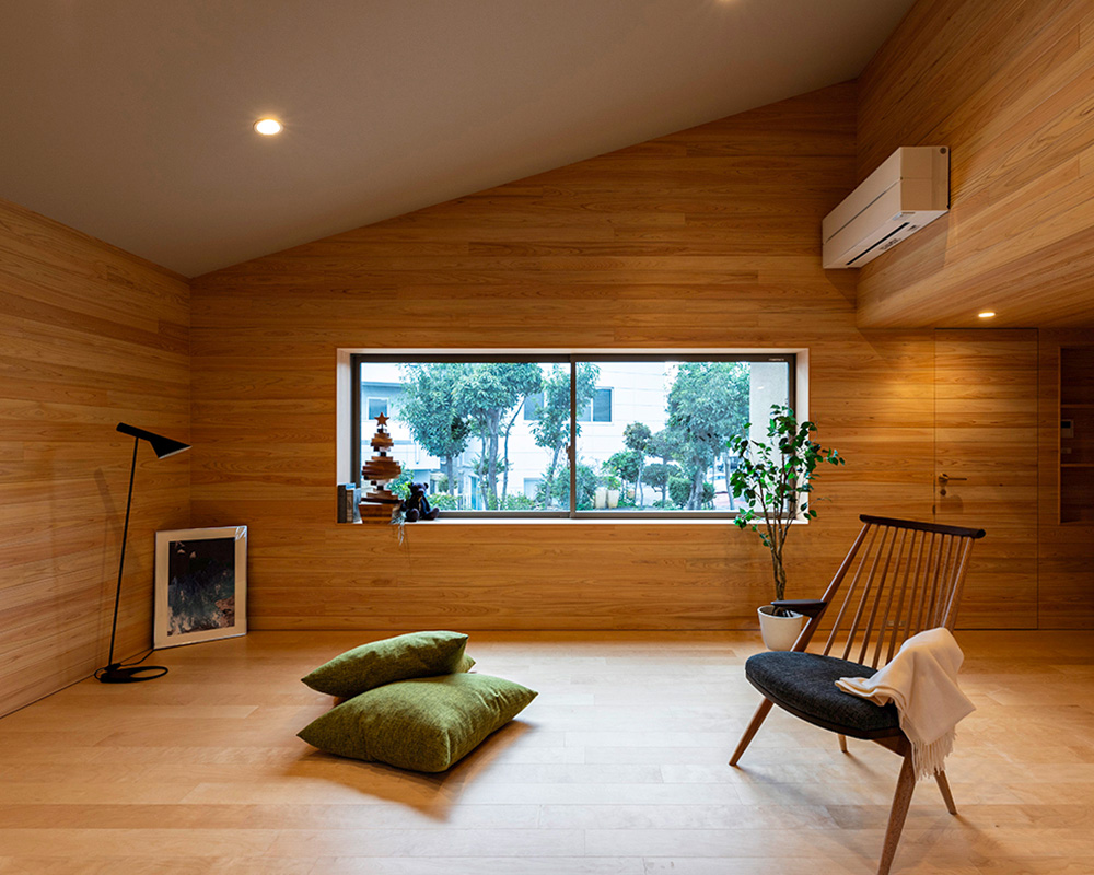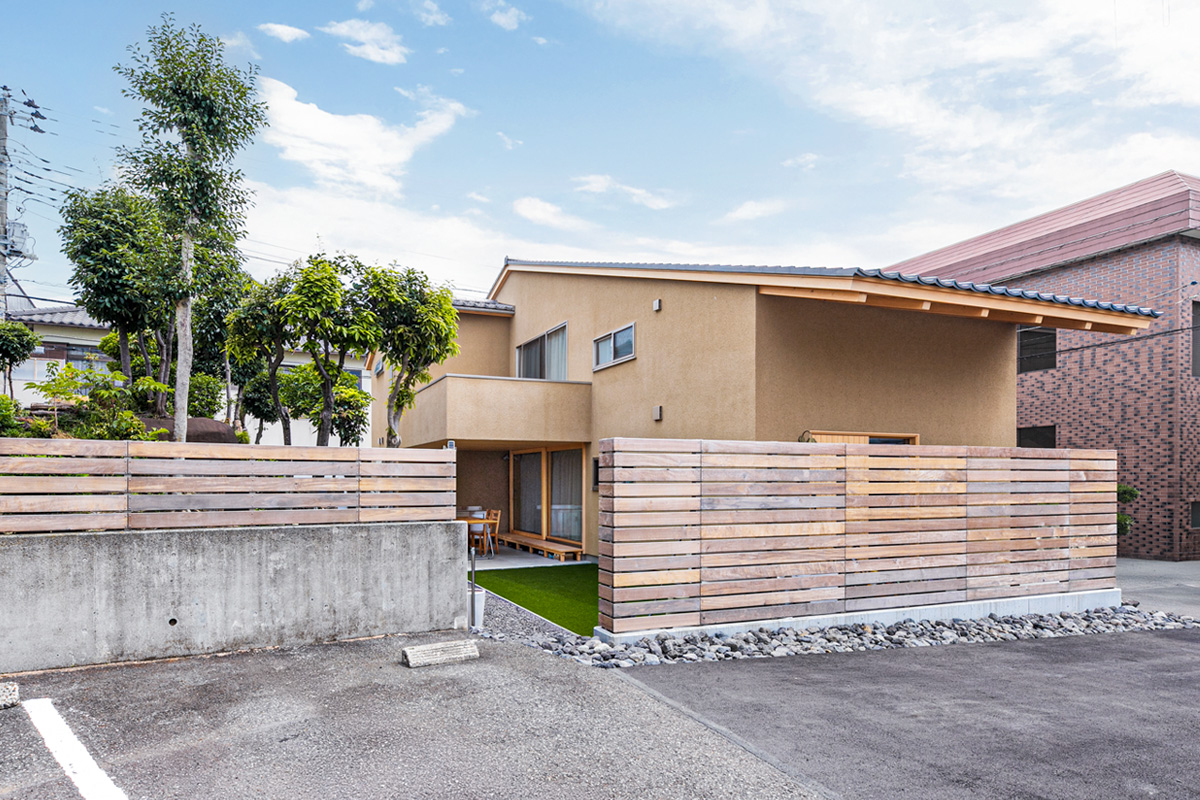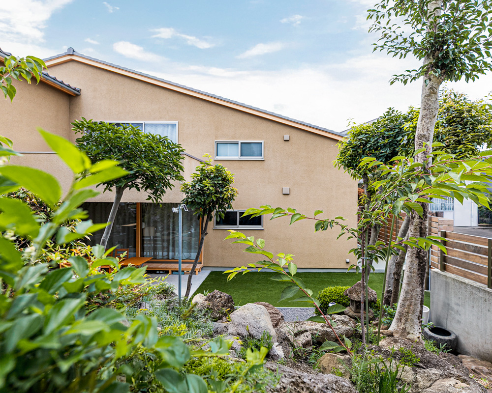 自然素材と職人技に包まれ、周囲の緑豊かな景色を取り込むように設計された二世帯住宅。リビングの大開口からは、季節の移ろいを感じる庭を望むことができ、外部からの視線もほどよく遮られた穏やかで心地よい空間が広がります。内装には、家主である平成建設の漆職人が手がけた「拭き漆」の壁をはじめ、檜の無垢材や真鍮、左官壁、瓦屋根など、自然素材をふんだんに採用。伝統の技と現代の暮らしが調和する設えが、時を重ねるほどに味わいを深めます。
