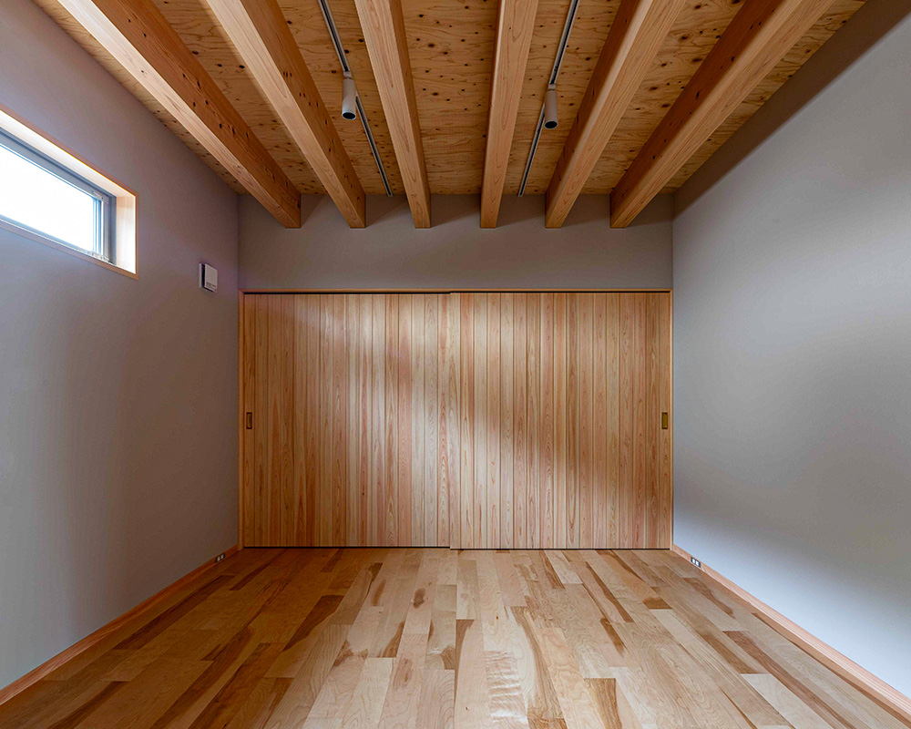 天井高2.5mのゆとりある空間。無垢檜の梁と建具が調和し、静かで落ち着ける寝室に。