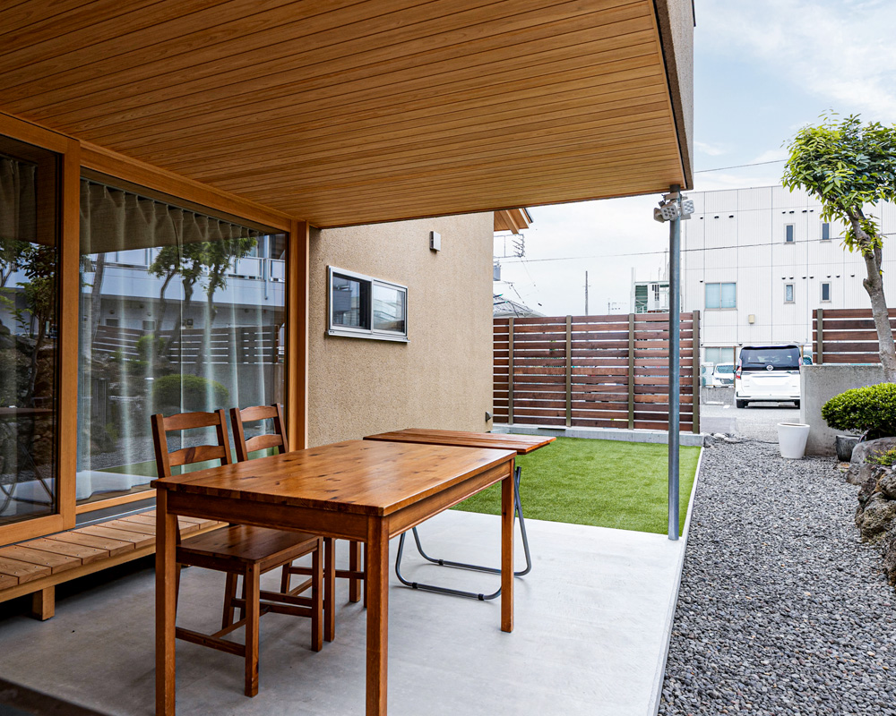 深い軒下の土間空間は、机を置いてアウトドアリビングとしても活用可能。