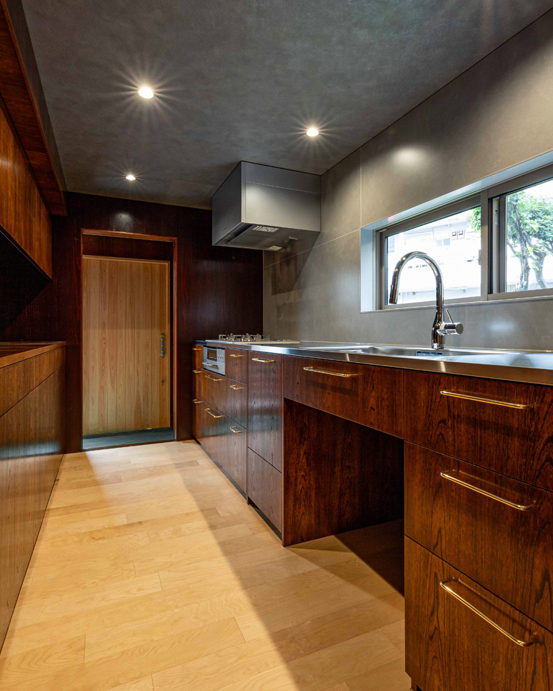 設計士がデザインし、大工が製作したオリジナルキッチン。仕上げには水に強い漆を採用。